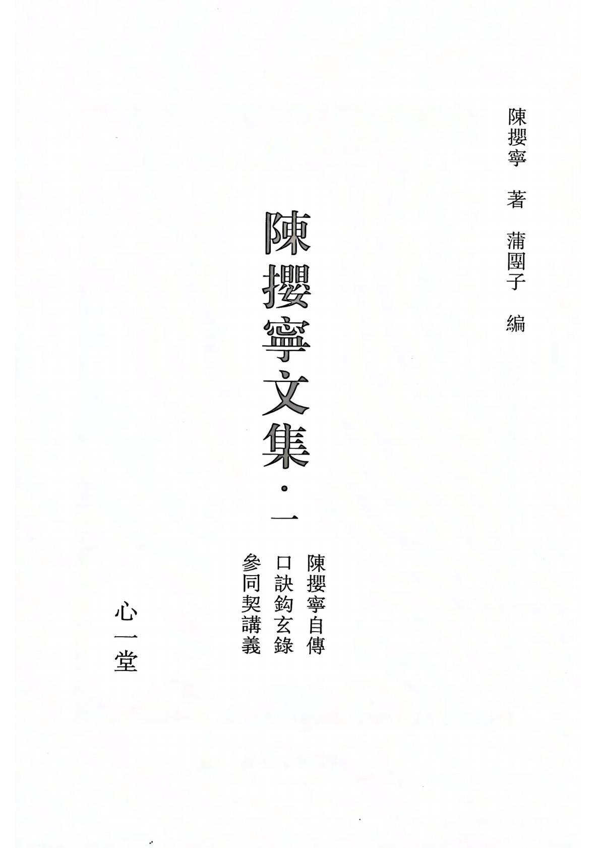 第一册 陳攖寧先生小傳 陳攖寧文集序 陳攖寧文集收錄書目及整理情况 陳攖寧自傳 陳攖寧自傳一 陳攖寧自傳二 仙學專著卷上 黄庭經講義 黄庭經講義王序 黄庭經講義 弁言 第一章黄庭 第二章泥丸 第三章魂魄 第四章呼吸 第五章漱津 第六章存神 第七章致虛 第八章斷欲 孫不二女功内丹次第詩註 孫不二女丹詩註黄序 孫不二女功内丹次第詩註凡例 孫不二仙姑事略 孫不二女功内丹次第詩十四首 孫不二女功内丹次第詩註 收心第一 養氣第二 行功第三 斬龍第四 養丹第五 胎息第六 符火第七 接藥第八 鍊神第九 服食第十 辟穀第十一 面壁第十二 出神第十三 冲舉第十四 口訣鈎玄錄初集 第一篇讀者須知 第一章學說之根據 第二章書名之意義 第三章應具之常識 第一節道家與道教之異同 第二節道家與儒家之異同 第三節道家與佛家之異同 第四節道家與神仙家之異同 第四章口訣之來源 第一節傳授口訣之慎重 第二節口訣不肯輕傳之理由 靈源大道歌白話註解 蔣竹莊先生序 張任父先生序 洪太庵先生序 高克恭先生序 趙慧昭女士序 朱昌亞女士序 靈源大道歌讀者須知 靈源大道歌 靈源大道歌白話註解 附錄 吴彝珠女士跋 靈源大道歌白話註解跋 參同契講義(甲本) 周易參同章第一 乾坤二用章第二 中宫土德章第三 日月神化章第四 朔受震符章第五 天心建始章第六 日月始終章第七 藥生象月章第八 陰符轉統章第九 象彼仲冬章第十 推度符徵章第十一 御政之首章第十二 内以養己章第十三 知白守黑章第十四 道術是非章第十五 二八弦氣章第十六 金火含受章第十七 二土全功章第十八 金丹妙用章第十九 同類相從章第二十 背道迷真章第二十一 三聖前識章第二十二 金火銖兩章第二十三 水火情性章第二十四 古今道一章第二十五 乾坤精氣章第二十六 入室休咎章第二十七 晦朔合符章第二十八 卦律火符章第二十九 性命根宗章第三十 二氣感化章第三十一 關鍵三寶章第三十二 旁門無功章第三十三 珠華倡和章第三十四 五行逆尅章第三十五 龍虎主客章第三十六 不得其理章第三十七 父母滋禀章第三十八 藥物至靈章第三十九 天元配合章第四十 日月含吐章第四十一 四象歸土章第四十二 陰陽反覆章第四十三 牝牡相須章第四十四 繼往開來章四十五 丹法全旨章第四十六 鼎器歌第四十七 序第四十八 第二册 仙學專著卷中 參同契講義(乙本) 業餘講稿] 仙學必成 爲淨密禪仙息爭的一封信 五祖七真像傳 神經衰弱靜功療養法問答